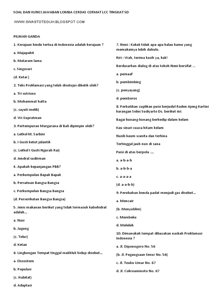 Gudang Soal Lomba Cerdas Cermat Lcc Dan Kunci Jawaban Babak Penyisihan Untuk Sekolah Dasar Sd Tingkat Kecamatan Tingkat Kabupaten Aneka Pendidikan from 4.bp.blogspot.com Lomba cerdas cermat (lcc) adalah kegiatan rutin yang biasa dilaksanakan di sekolah, di tingkat kecamatan juga di tingkat kota atau kabupaten, bahkan tidak menutup kemungkinan para juara tingkat kota atau kabupaten akan dilombakan lagi di tingkat provinsi untuk selanjutnya maju ke. Kumpulan soal soal cerdas cermat bahasa inggris sma beserta kunci jawabannya sahabat sbi yang super kali ini agak berbeda ya tentunya sahabat sbi sering. Ini hanyalah review, belilah buku aslinya dan nikmati karya penulisnya dengan cerdas. Soal osk matematika smp tingkat kota/kabupaten 2017. Mengundang seluruh siswa smp/mts di wilayah diy dan jawa tengah, untuk berpartisipasi dalam acara lomba cerdas cermat bidang ips yang diselenggarakan oleh himpunan mahasiswa pips, fakultas ilmu sosial, universitas negeri yogyakarta, yang akan dilaksanakan pada: Matematika try out sd 2008 by kumpulan soal sn. Lomba cerdas cermat tingkat smp paket soal nomor i (satu). Soal latihan cerdas cermat ipa tingkat smp/mts.